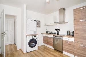 This single-bedroom apartment includes a living room with a flat-screen TV offering streaming services such as Netflix, perfect for unwinding after exploring the city. The full kitchen comes equipped with modern appliances including a stovetop, refrigerator, dishwasher, toaster, coffee machine, electric kettle alongside tea and coffee making facilities. Guests will also find amenities like a seating area with sofa bed options and work desk, laundry needs are covered by an in-unit washing machine and tumble dryer complemented by ironing facilities.